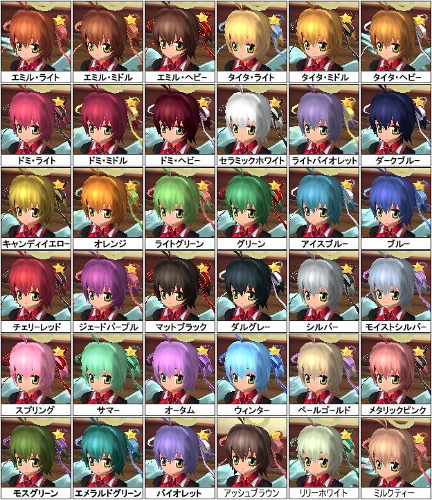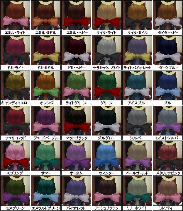 | セラミックホワイト、ダークブルー、ライトバイオレット、ペールゴールド、メタリックピンク画像募集中 ヘアカラー・リボン色の一覧 |