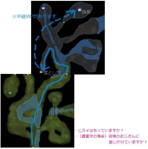 | [1]ノーザンD内のイグルーよろず屋(凍える商人)の隣のWP [2]鉄火山MAP中央最南にあるシェルターのWP [3]ファーイースト役場に居る役場のおじさんに話しかける →イーストDニンフ族長に会う(ヒスイ必須) →族長と会話後自動的にモーグへ飛ばされる (モーグに飛ばされるまでが1イベントなので途中で他の所へ行かない事) | ※順不同OK 憑依× 進まない時は憑依されていないか確認 行先はどれも開始できるレベルでは職業によっては目的地にたどり着く前に戦闘不能になる危険性が高いので注意。 特に[1]はダンジョンの入り口に到着するまでもとても危険で、ダンジョン内でも道を間違えると結構簡単に蒸発できます。 |